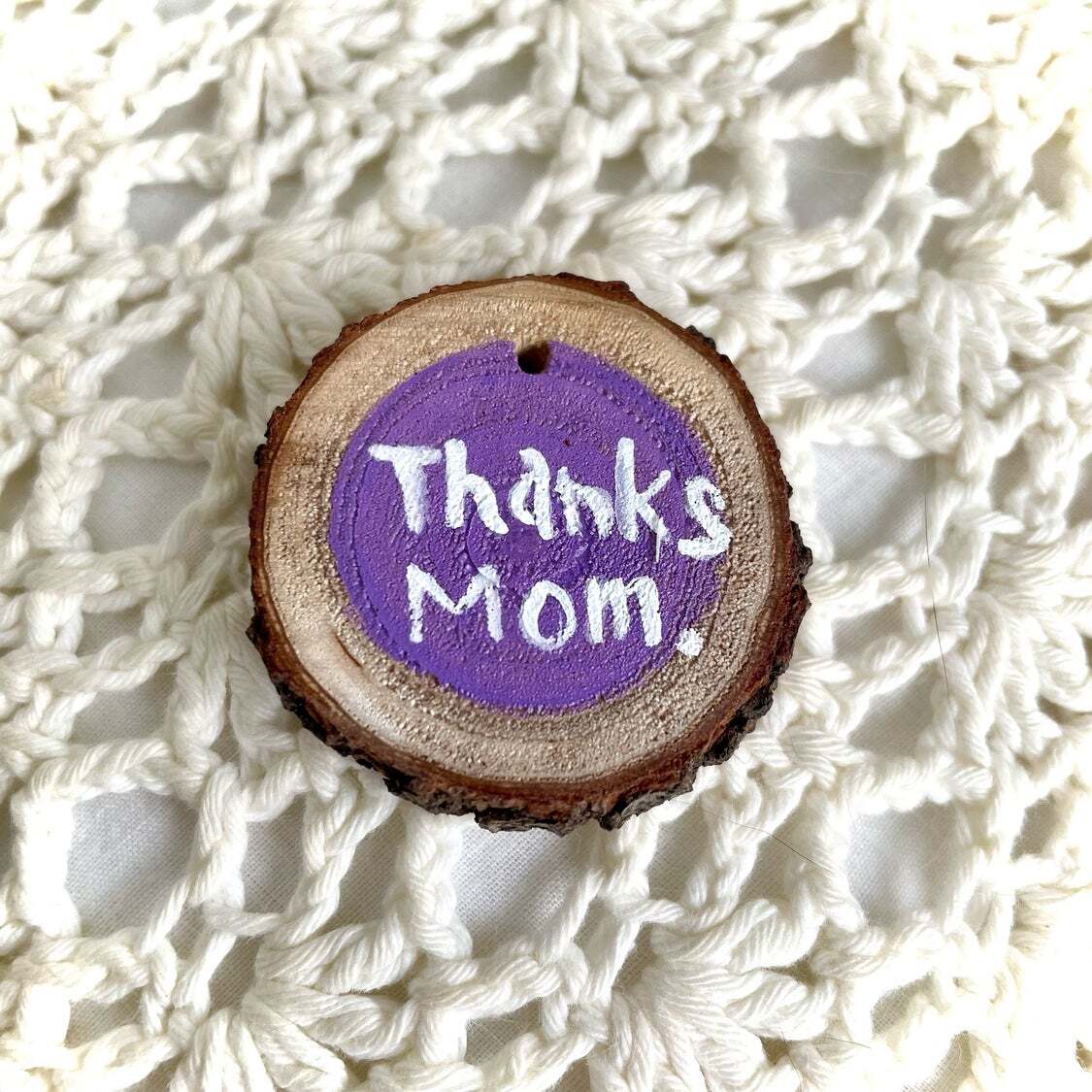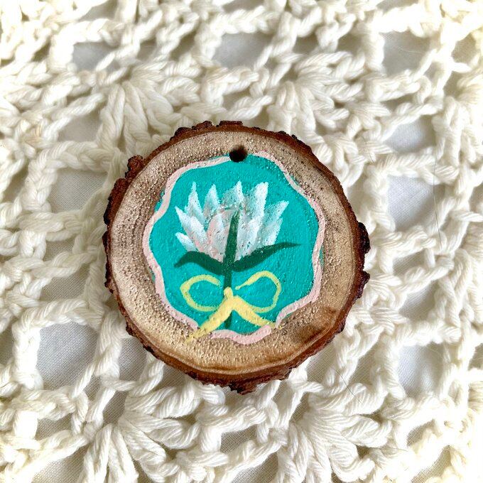 こちらは、天然の楠のスライスにアクリルペイントで描いています。ペイントしていない裏面に、お好きなアロマをしみ込ませて、お使いください。