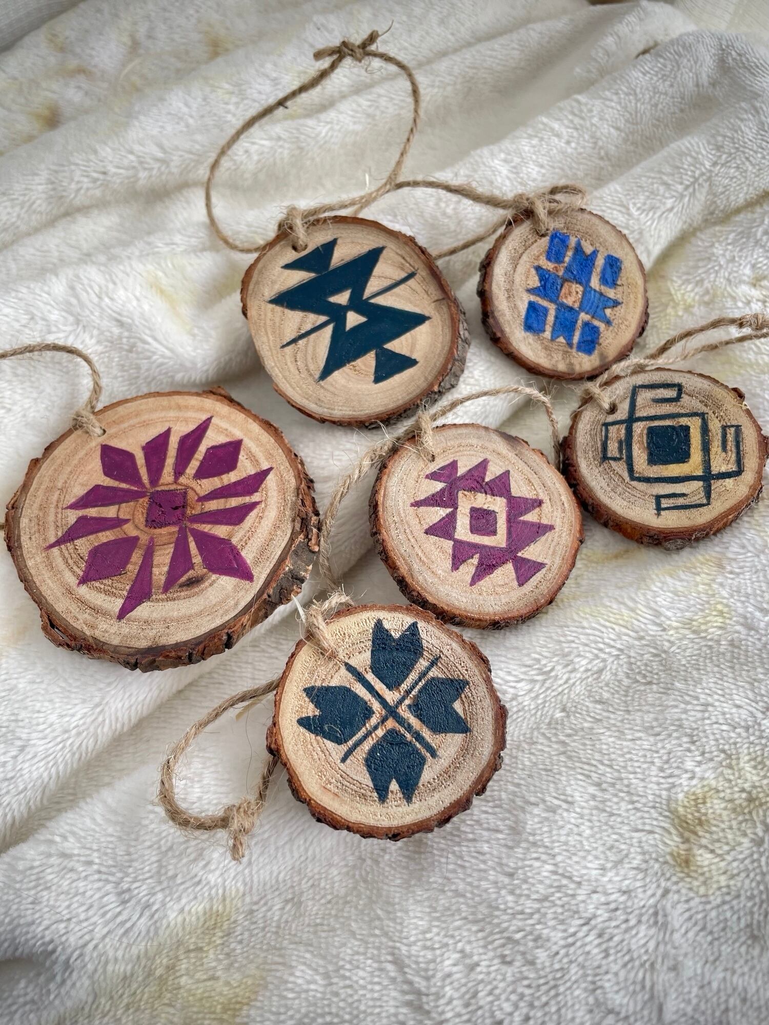 こちらは、天然の楠のスライスにアクリルペイントで、モチーフを描いています。